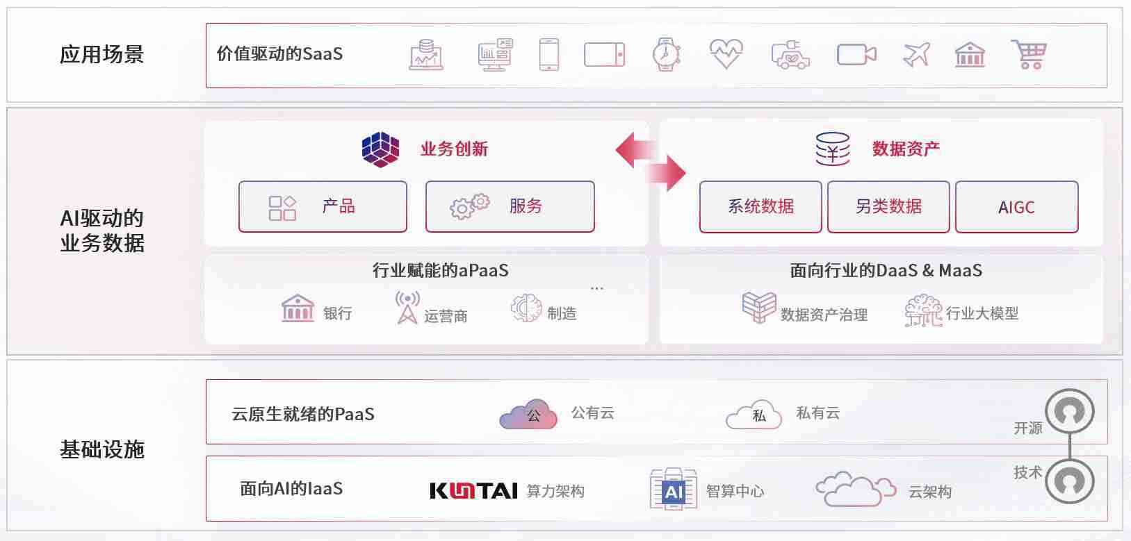 在基础设施层面,,,,基于商业或开源的云原生就绪开发工具与技术组件(PaaS)和面向AI的底层公共基础设施资源(IaaS),,,,将共同支撑企业完成数字化转型