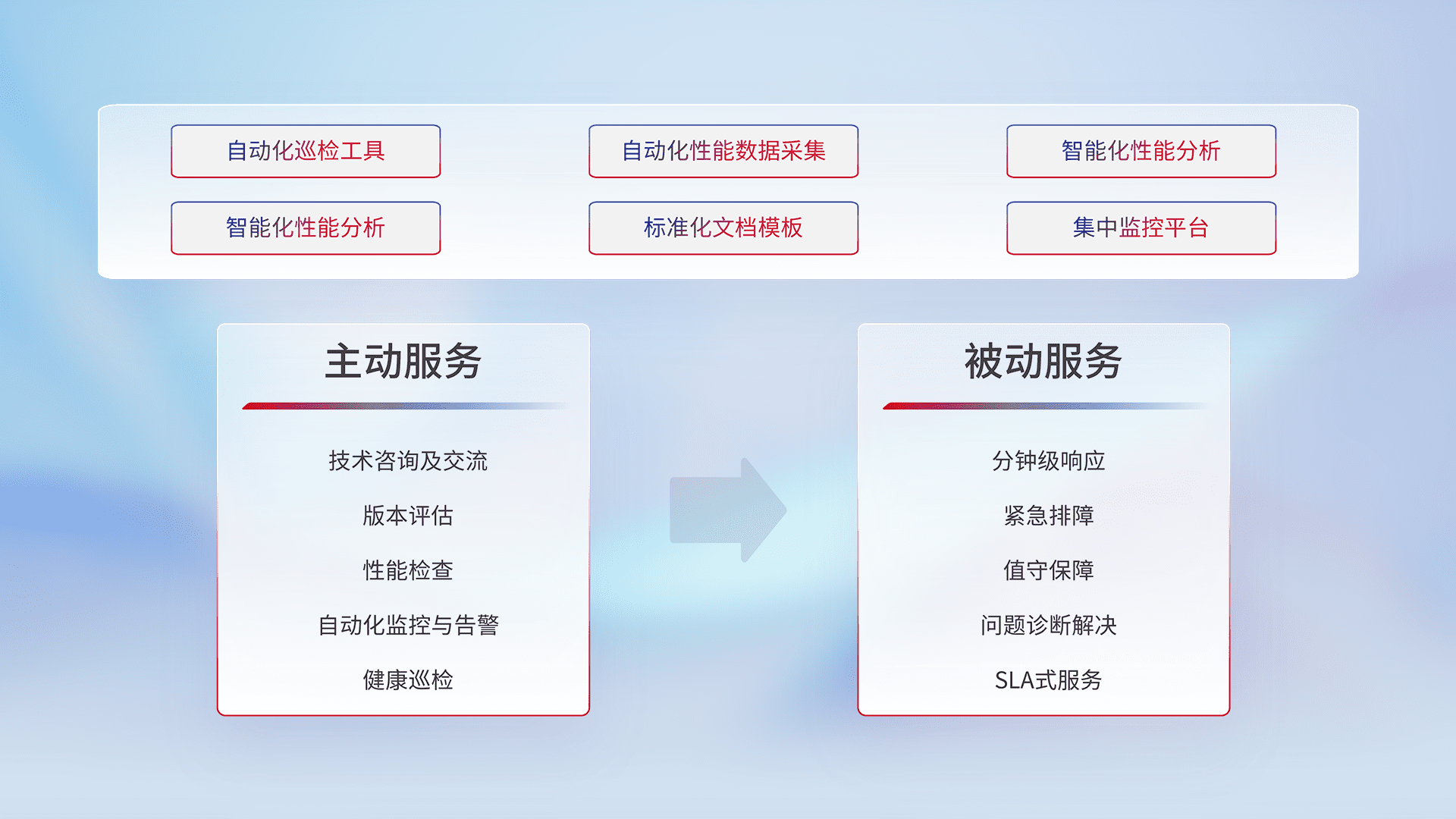 智能化工具和标准化文档,,,,保障服务质量,,,提供主动服务(包含技术咨询、、、、版本评估、、、、性能检查、、、、自动化监控与告警、、、健康巡检)和被动服务包含(分钟级响应、、、、紧急排障、、、、值守保障、、、问题诊断解决、、SLA服务)。。。。