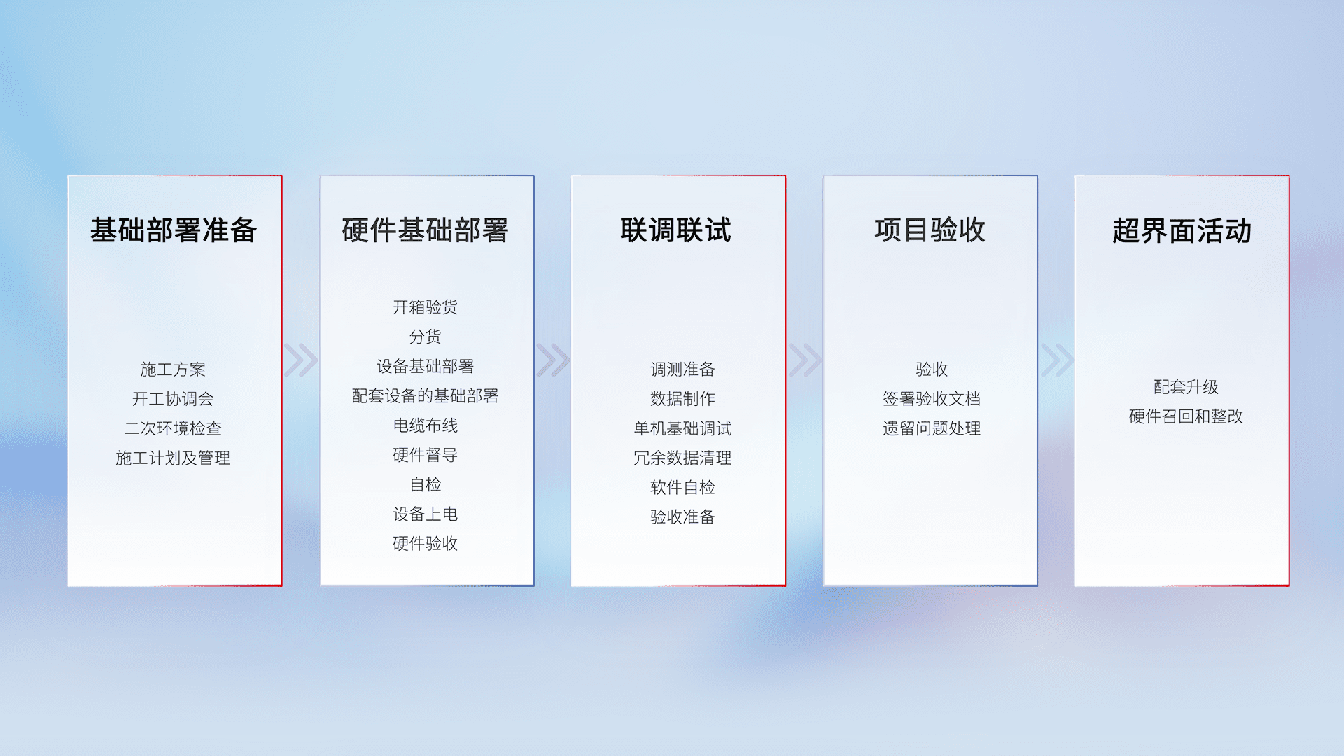 从基础部署准备、、硬件基础部署、、联调联试、、、、项目验收、、、、越界面活动的全过程可追溯,,,,保证施工质量和进度。。